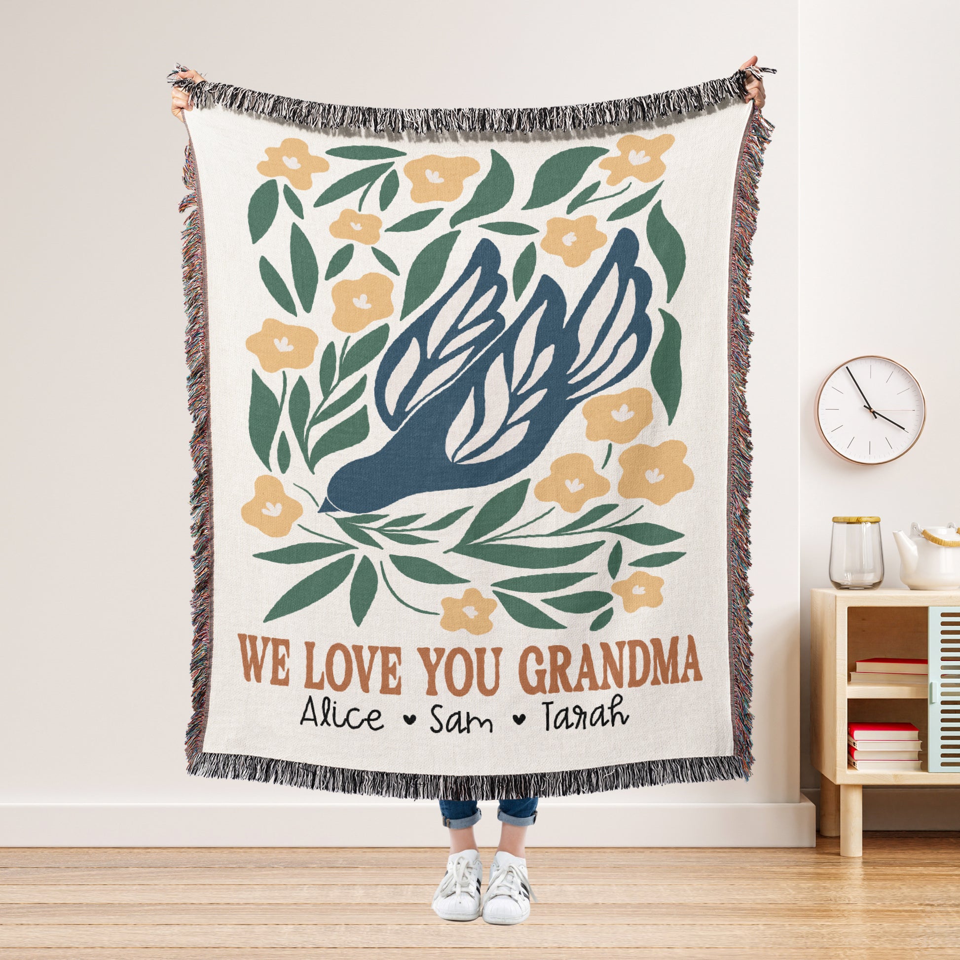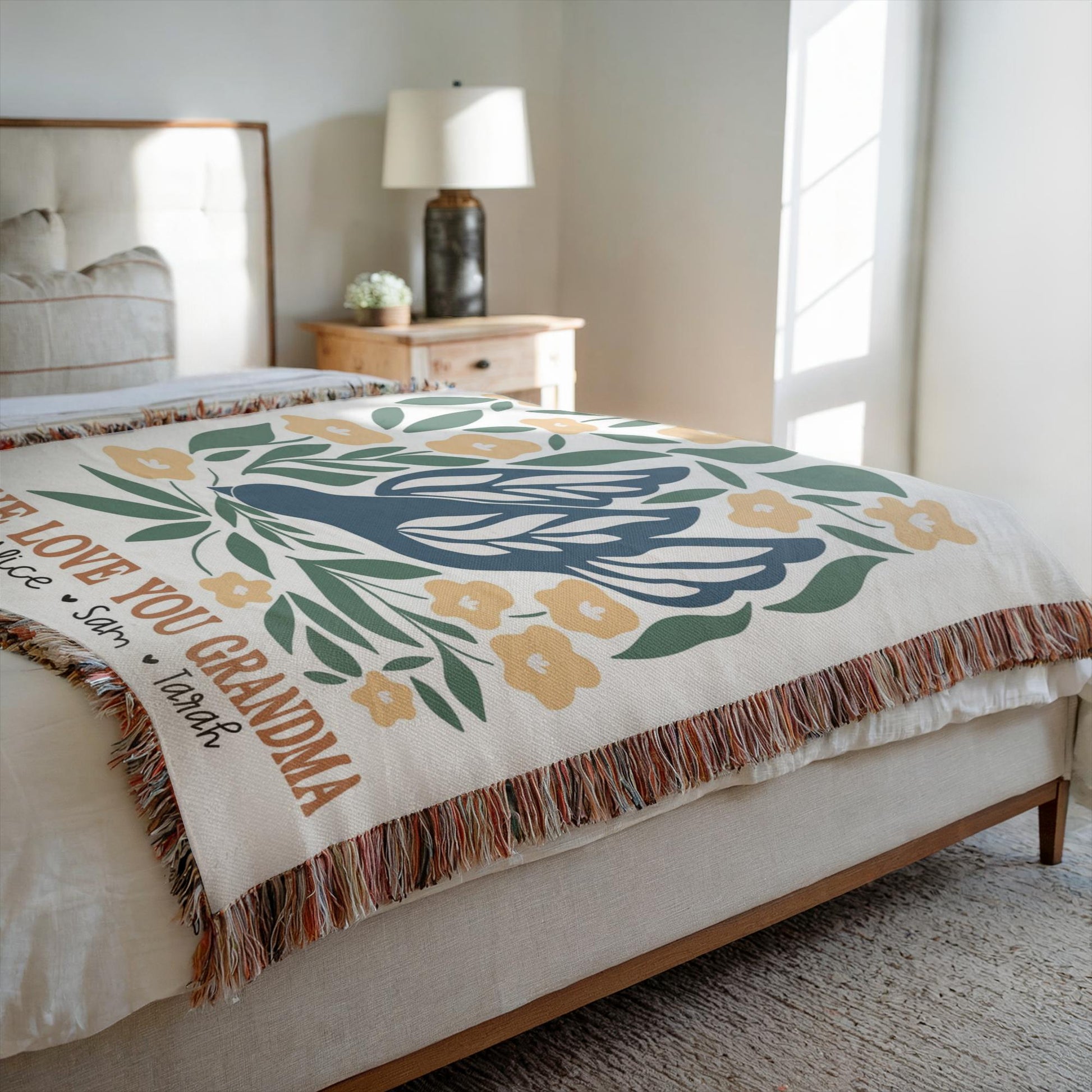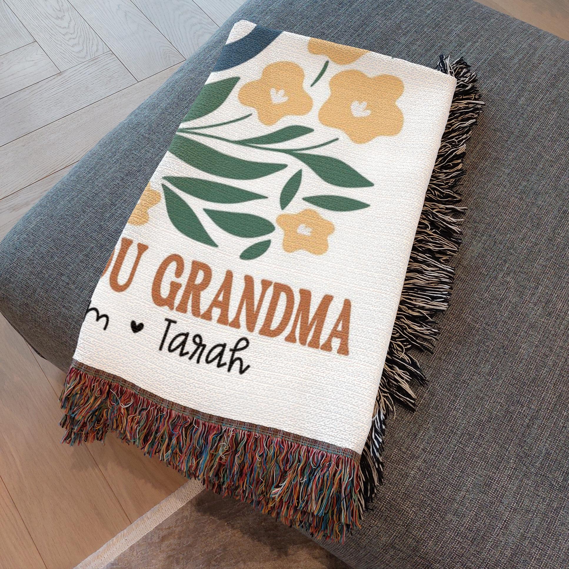 Wrap Grandma in love with our 100% cotton woven blanket, beautifully personalized with your family’s names and the heartfelt message “We Love You Grandma.” Each blanket is carefully woven, not printed, giving it a rich texture and timeless quality. Made from soft, premium cotton, it’s perfect for cozy movie nights, afternoon naps, or adding a warm touch to any room. A meaningful gift she’ll treasure forever, ideal for birthdays, Christmas, Mother’s Day or any moment you want to make her feel special.