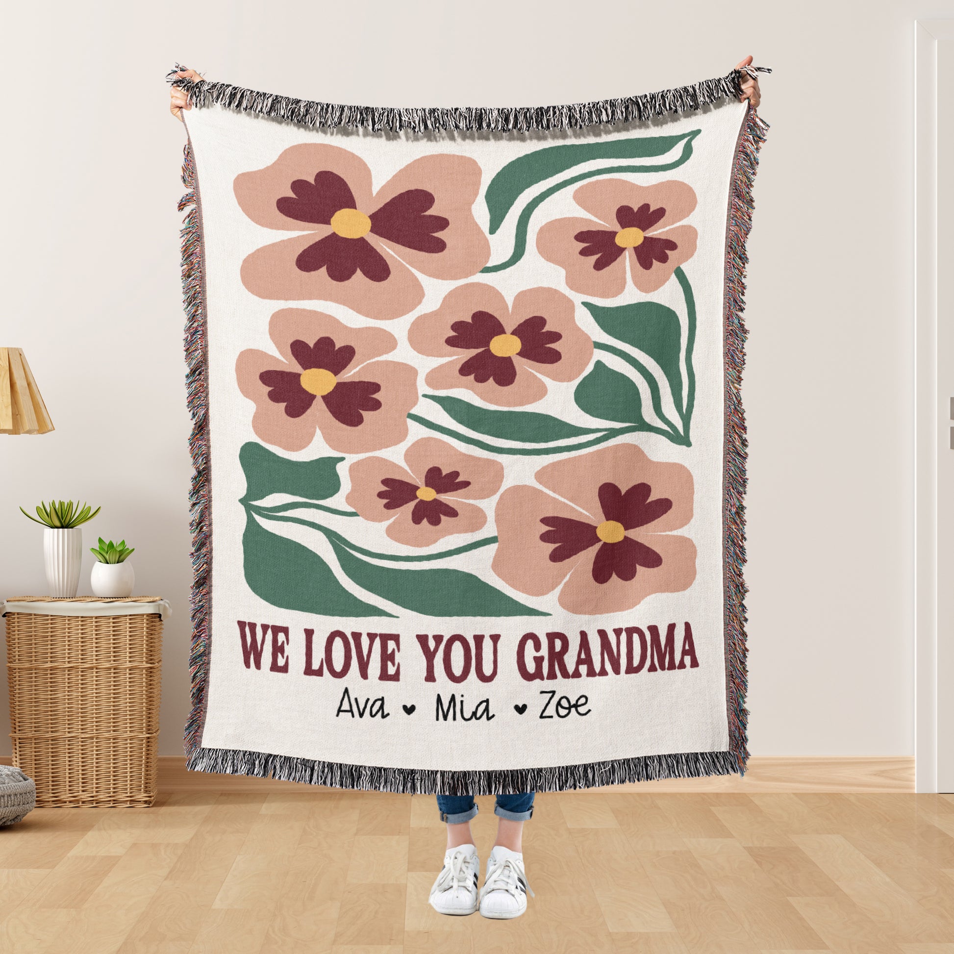 Wrap Grandma in love with our 100% cotton woven blanket, beautifully personalized with your family’s names and the heartfelt message “We Love You Grandma.” Each blanket is carefully woven, not printed, giving it a rich texture and timeless quality. Made from soft, premium cotton, it’s perfect for cozy movie nights, afternoon naps, or adding a warm touch to any room. A meaningful gift she’ll treasure forever, ideal for birthdays, Christmas, Mother’s Day or any moment you want to make her feel special.