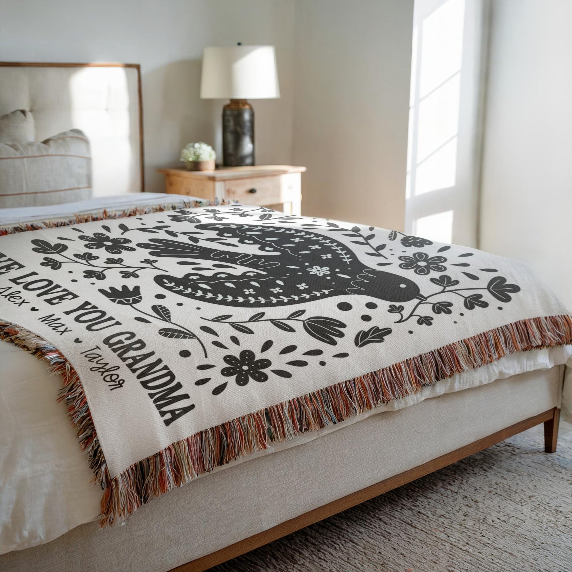 Wrap Grandma in love with our 100% cotton woven blanket, beautifully personalized with your family’s names and the heartfelt message “We Love You Grandma.” Each blanket is carefully woven, not printed, giving it a rich texture and timeless quality. Made from soft, premium cotton, it’s perfect for cozy movie nights, afternoon naps, or adding a warm touch to any room. A meaningful gift she’ll treasure forever, ideal for birthdays, Christmas, Mother’s Day or any moment you want to make her feel special.
