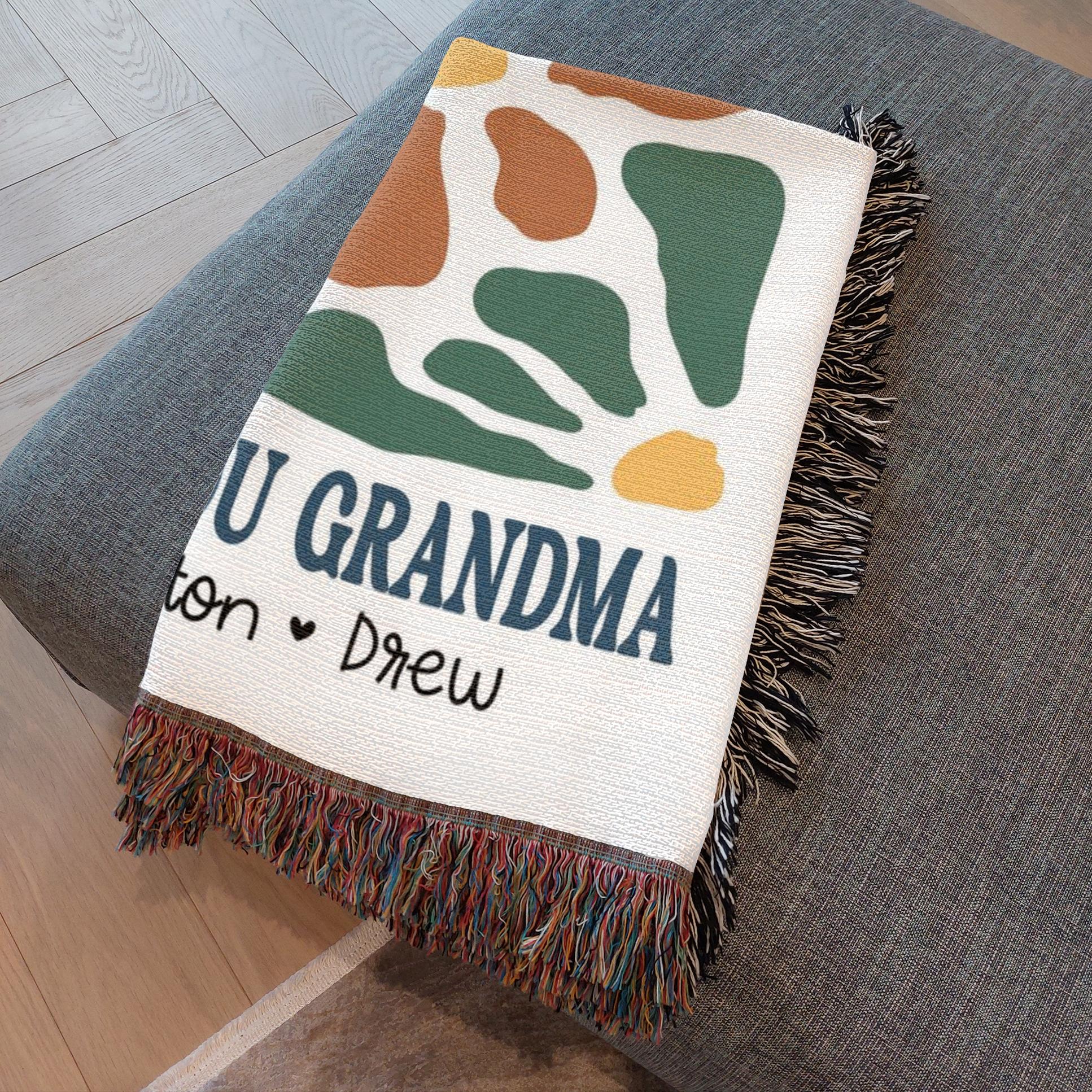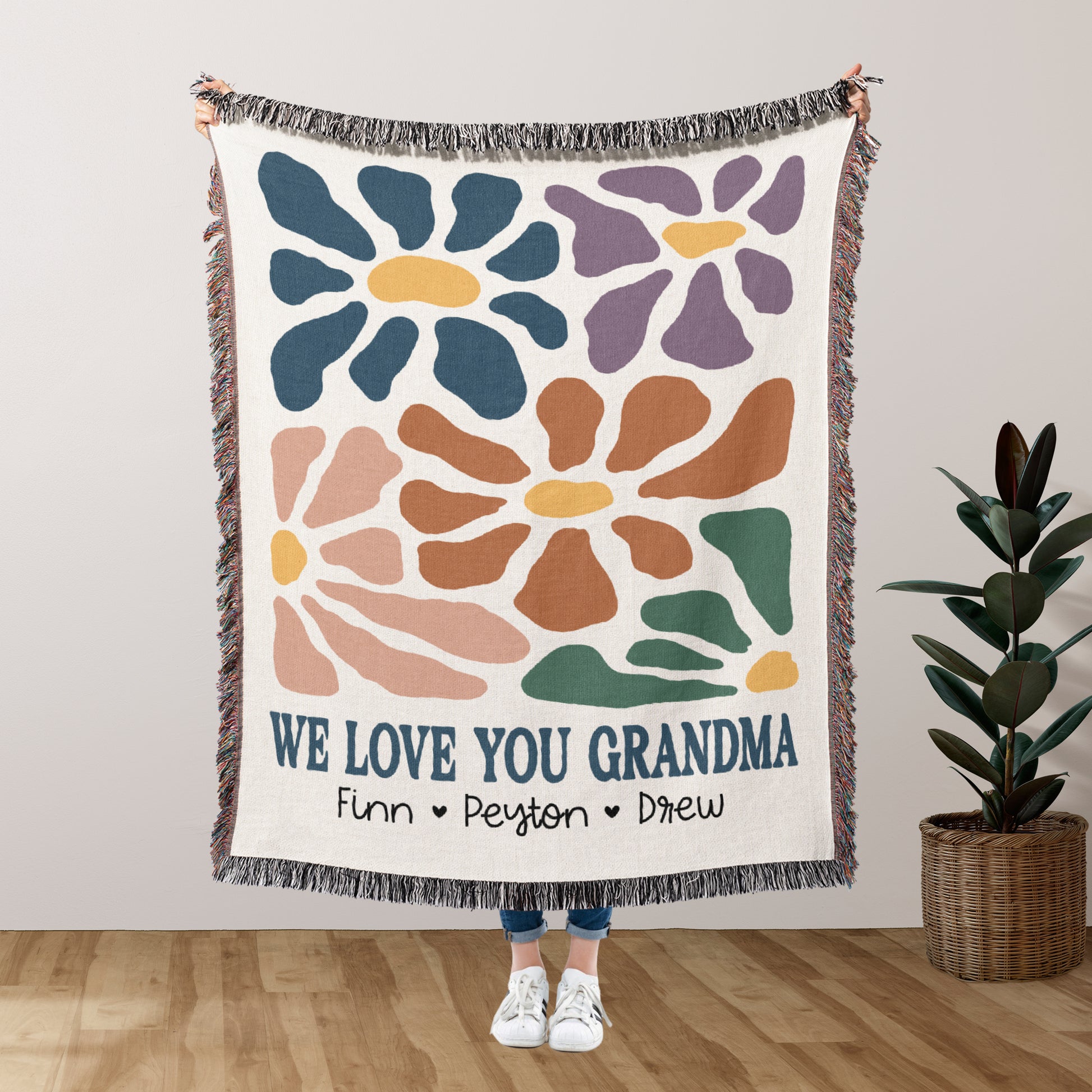 Wrap Grandma in love with our 100% cotton woven blanket, beautifully personalized with your family’s names and the heartfelt message “We Love You Grandma.” Each blanket is carefully woven, not printed, giving it a rich texture and timeless quality. Made from soft, premium cotton, it’s perfect for cozy movie nights, afternoon naps, or adding a warm touch to any room. A meaningful gift she’ll treasure forever, ideal for birthdays, Christmas, Mother’s Day or any moment you want to make her feel special.